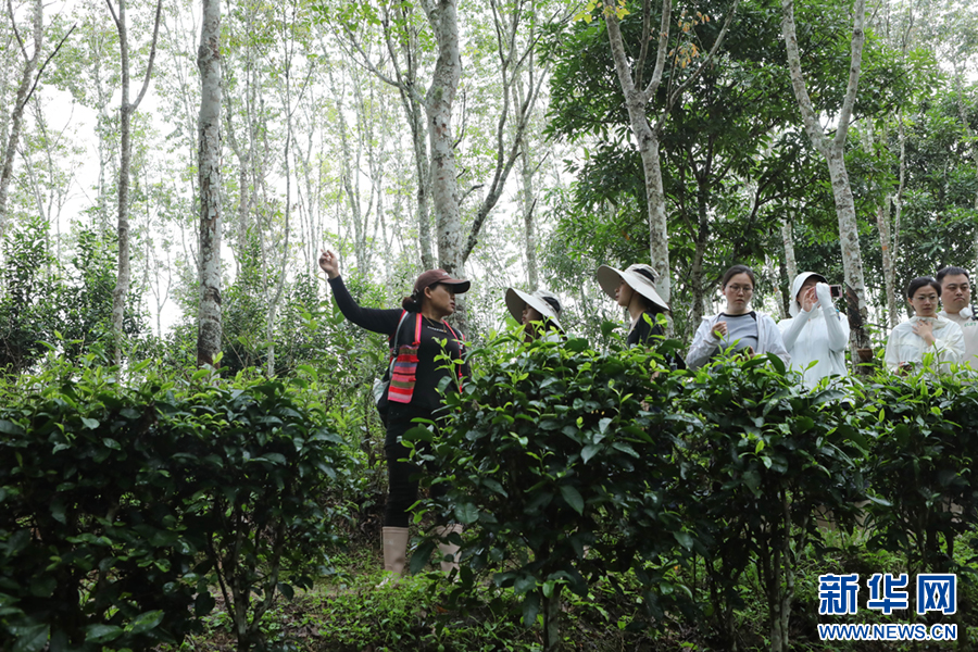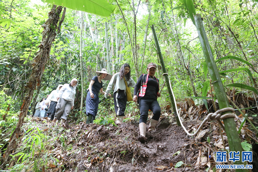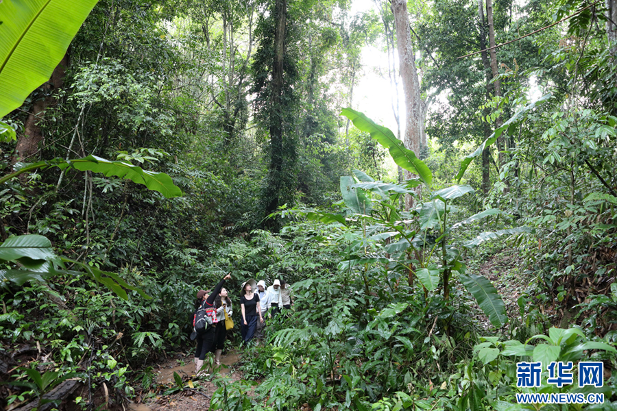 6月16日,云南省景洪市基諾山基諾族鄉新司土村委會么卓村小組村民肖施帶領游客在雨林中徒步。
