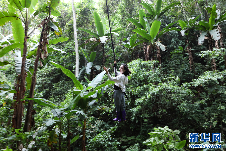 6月16日,游客在云南省景洪市基諾山基諾族鄉新司土村委會么卓村小組旁的雨林中體驗高空秋千。