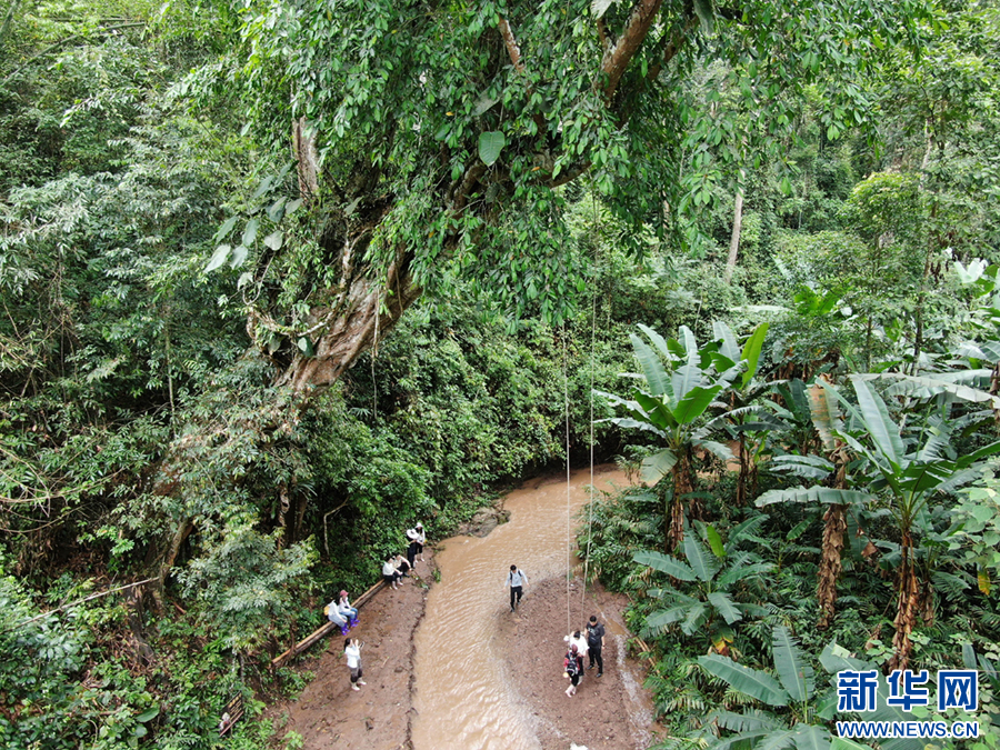 6月16日,游客在云南省景洪市基諾山基諾族鄉新司土村委會么卓村小組旁的雨林中游玩。
