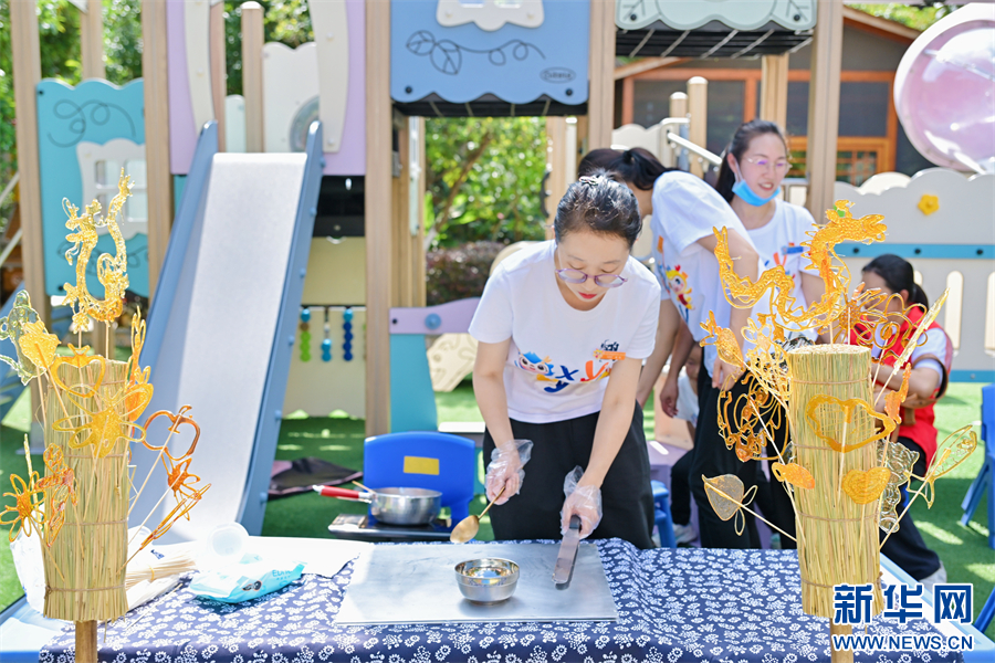 教師現場展示手工糖人制作(621日攝)。新華網發(新迎二幼 供圖)