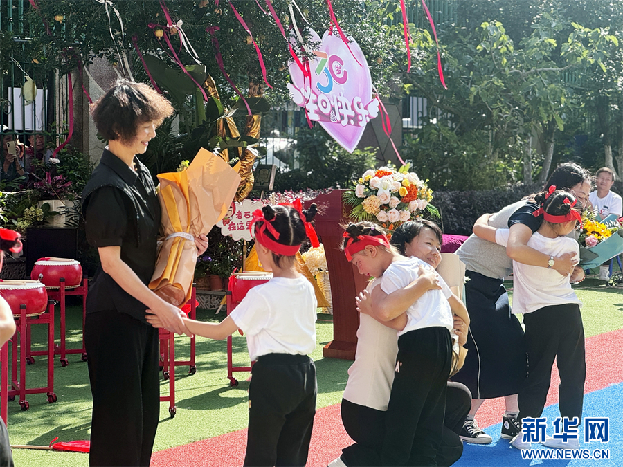 幼兒代表向歷任園長送上花束(621日攝)。新華網發(柴靜 攝)