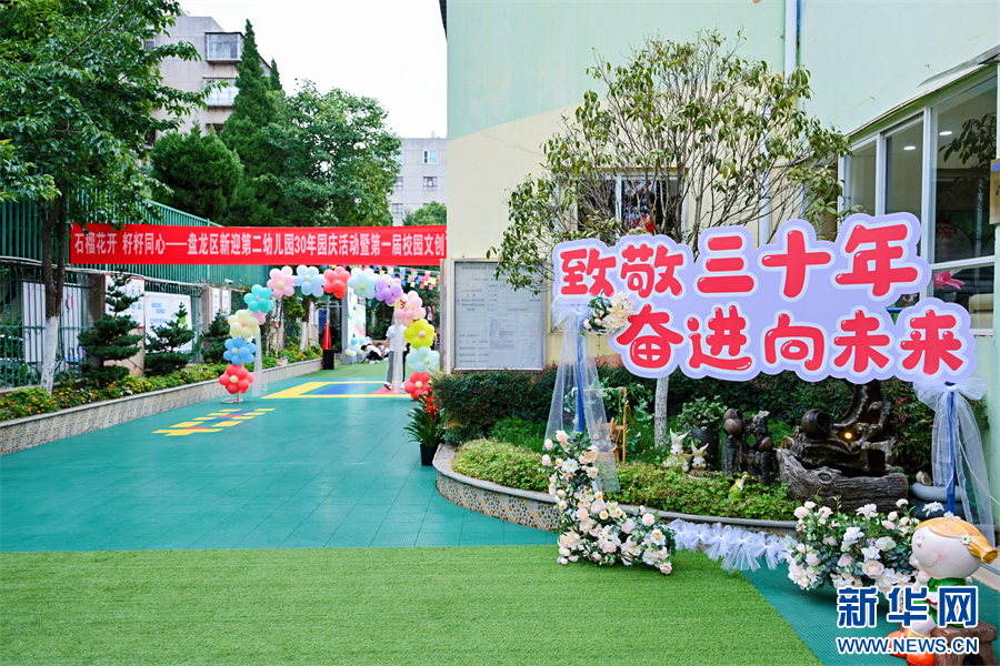 在發揚“石榴花開 籽籽同心”精神辦學的昆明市盤龍區新迎第二幼兒園(以下簡稱“新迎二幼”)內,一株已有30年樹齡的石榴樹掛滿了果實,與這棵石榴樹同歲的新迎二幼也于今年迎來了30歲生日。21日,在新迎第二幼兒園慶祝建園三十周年暨第一屆校園文創節活動中,師生們通過節目展演、幼兒手工文創成果展等展示了新迎二幼的教育教學成果。