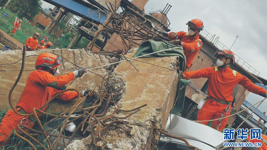 消防救援人員轉移受困假人(6月18日攝)。新華網發(郭俊 攝)