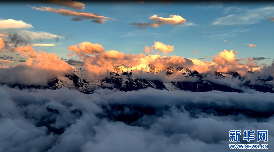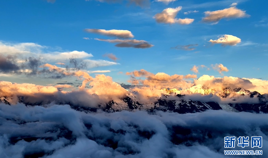 近日,攝影師在云南省迪慶藏族自治州德欽縣飛來寺附近,用無人機拍攝記錄下云層之上的梅里雪山“日照金山”的珍貴畫面。畫面中,清晨的日光染金了云層,白茫茫的雪山與藍色的天空相得益彰,美景令人震撼。(完)(德欽縣融媒體中心 李春雷)