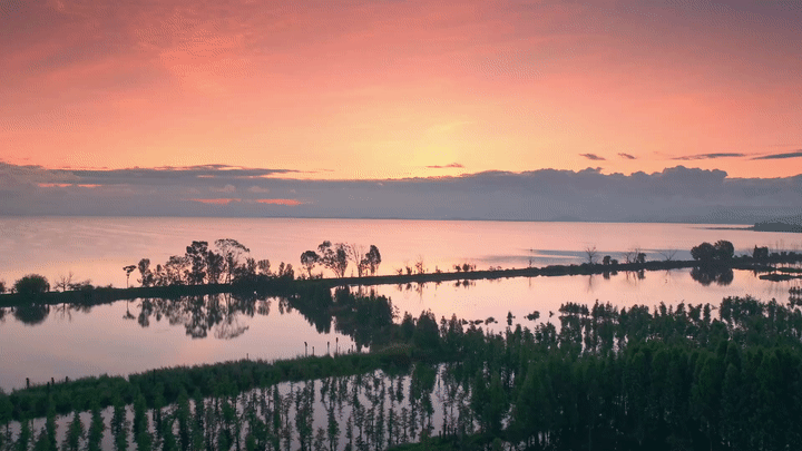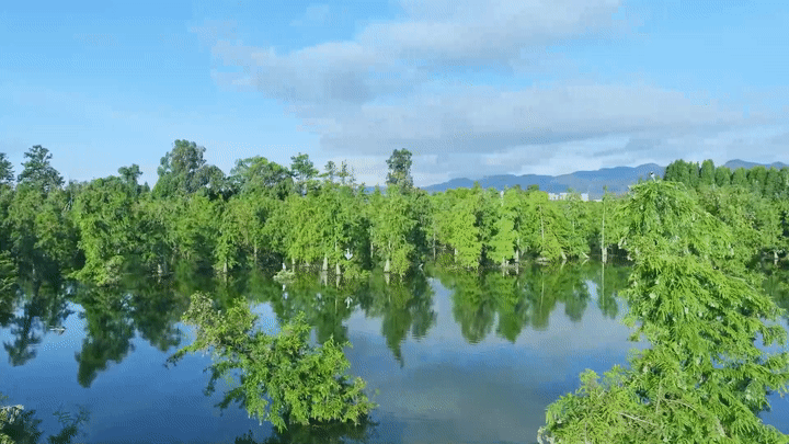 盛夏時節,云南晉寧南滇池國家濕地公園迎來繁茂季節。清晨,緋紅朝霞灑落濕地,翠綠杉林郁郁蔥蔥,藍天流云,倒映水中,構成一幅生機勃勃的生態畫卷。