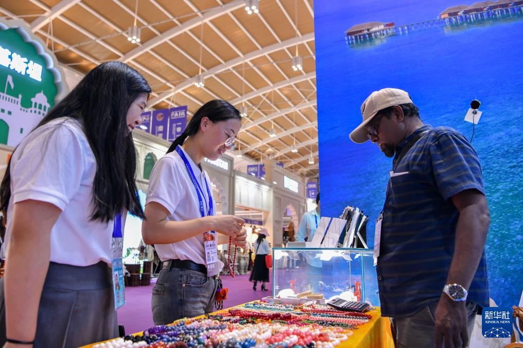 7月23日,兩名女士在第八屆中國—南亞博覽會南亞館挑選特色商品。新華社記者 劉蓮芬 攝