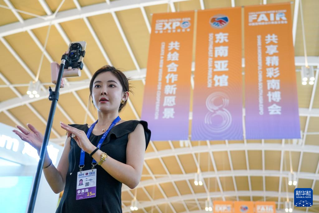 7月23日,參展商在東南亞館進行直播。新華社記者 王靜頤 攝