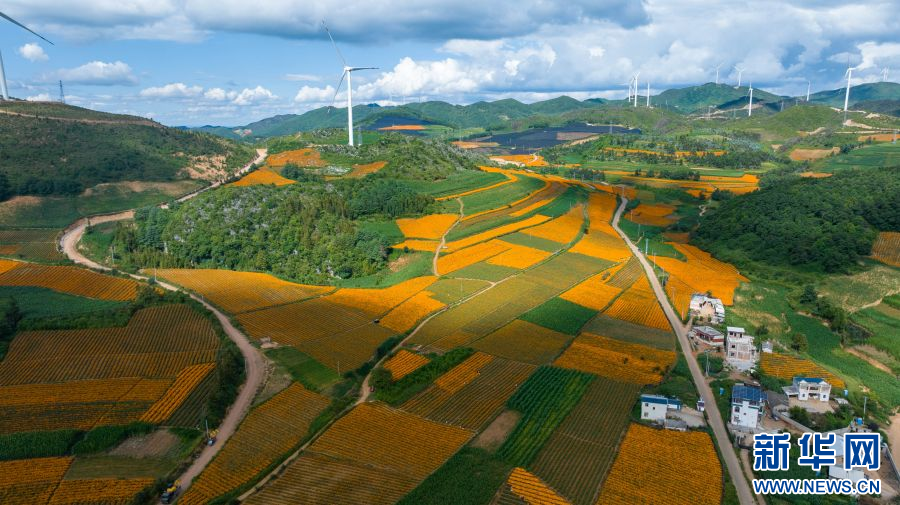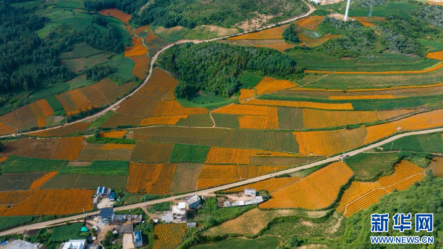 航拍萬壽菊(7月24日攝)。新華網發(李星 攝)