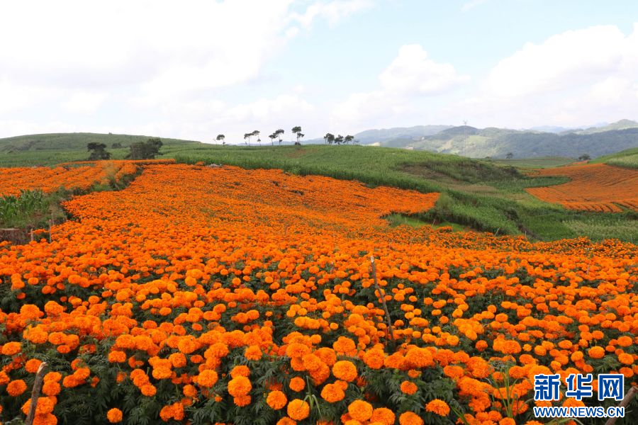 7月下旬,云南省紅河哈尼族彝族自治州蒙自市冷泉鎮萬畝萬壽菊進入采收期,采收期將持續至10月。