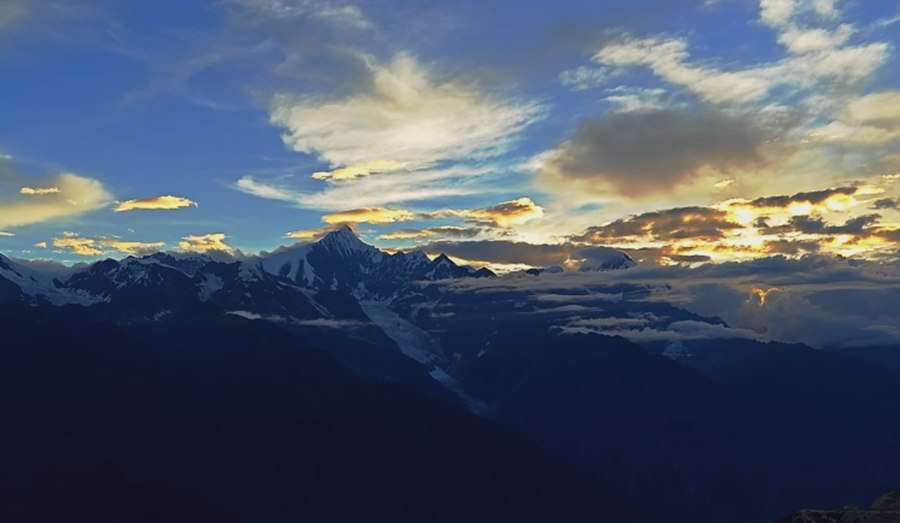 7月28日,攝影師在梅里雪山附近,用延時攝影記錄下梅里雪山的晚霞美景。畫面中,夕陽的光穿過層疊的云層,照耀在梅里雪山的皚皚白雪之上,勾勒出一幅動態的治愈畫卷。(完)(德欽縣融媒體中心 李春雷)