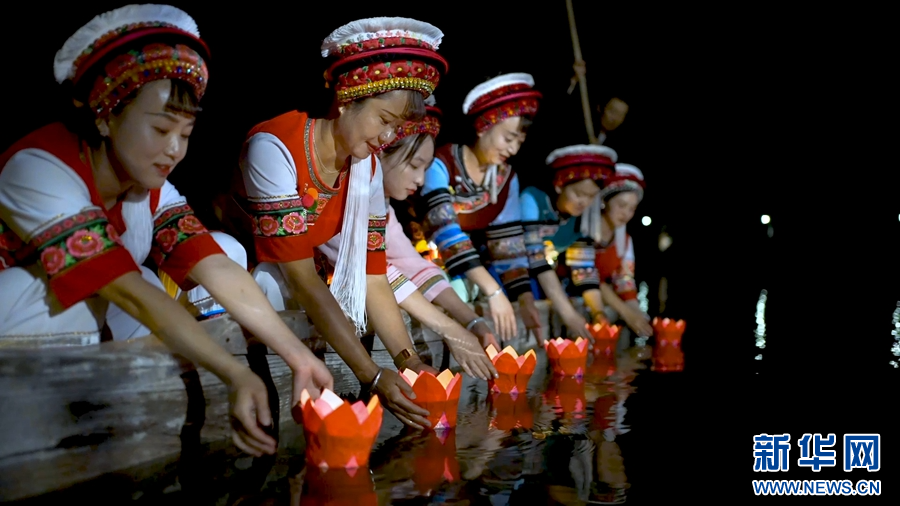 大理洱源西湖“水上火把節”,幾名白族姑娘放燈祈福(視頻截圖)。