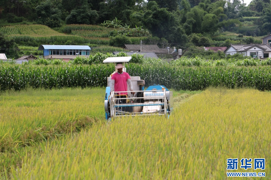 農戶正在收割水稻(8月2日攝)。新華網發(景谷縣融媒體中心供圖)