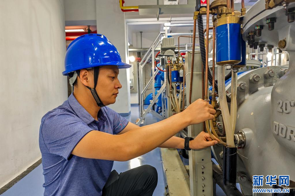 維護人員在緊固技術供水系統減壓閥排污管。