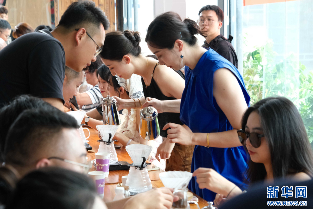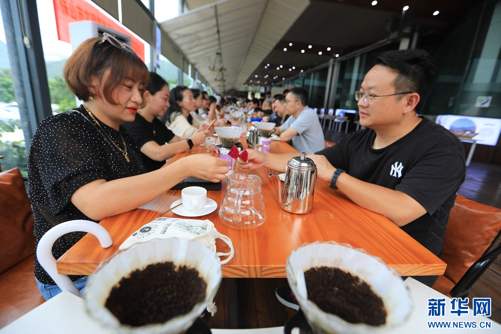 8月10日,參加婚禮的新人及嘉賓在保山市隆陽區潞江鎮比頓咖啡文化園沖泡咖啡,體驗當地文化。新華網發(龔祖金 攝)