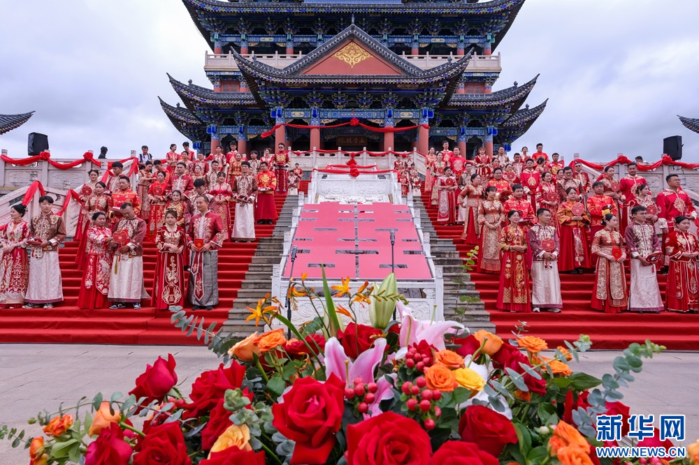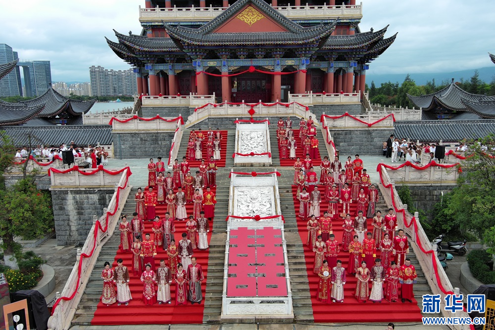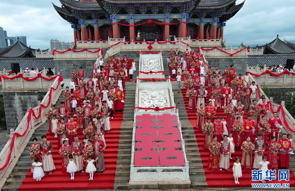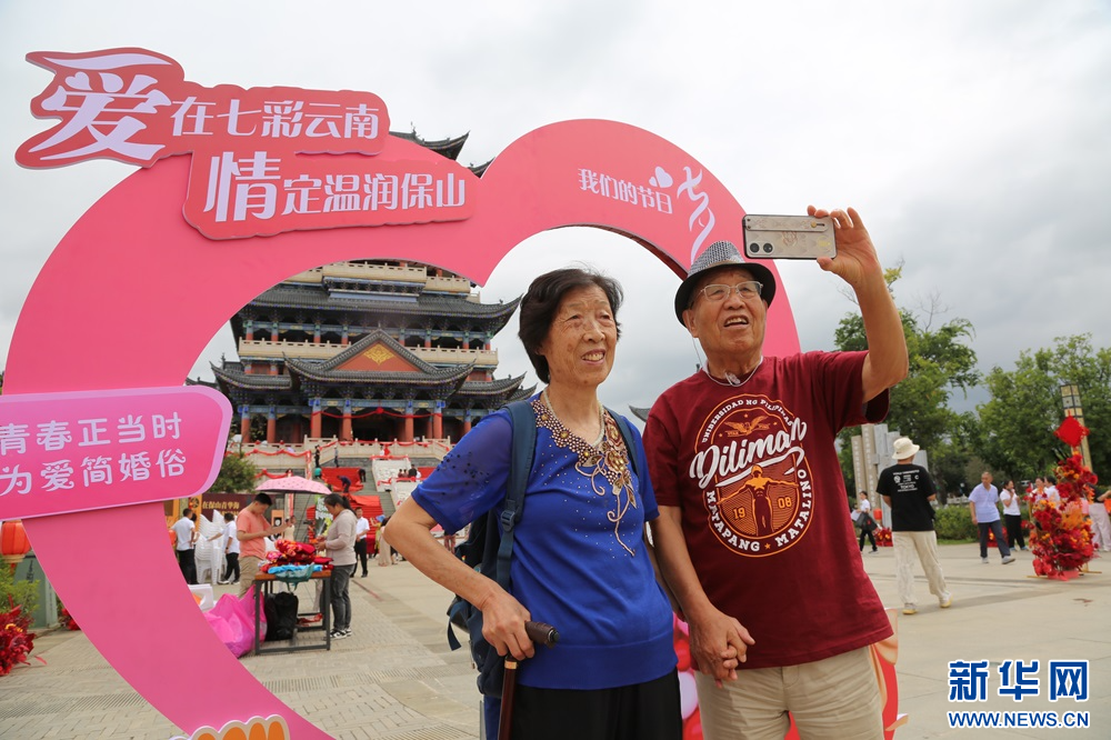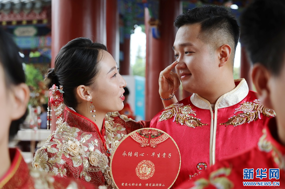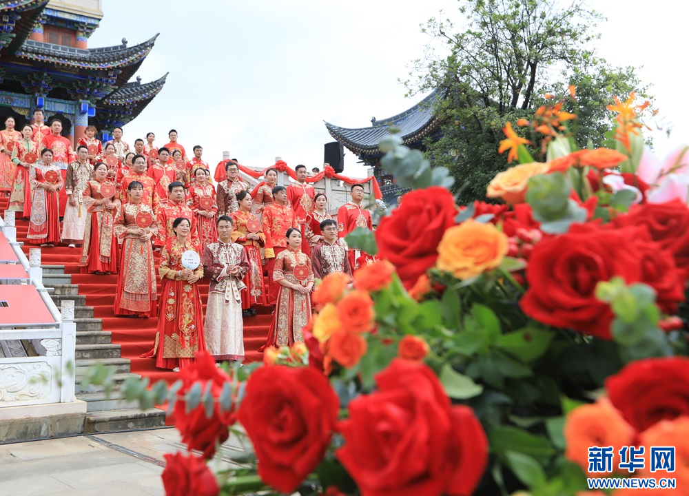 七夕當天,“愛在七彩云南·情定溫潤保山”集體婚禮活動在云南省保山市隆陽區青華海永昌閣舉行。來自全國各地的數對新人及嘉賓,身著華麗的中國傳統婚禮服飾,在現場觀眾的見證下喜結良緣,借此倡導文明婚慶新風尚。