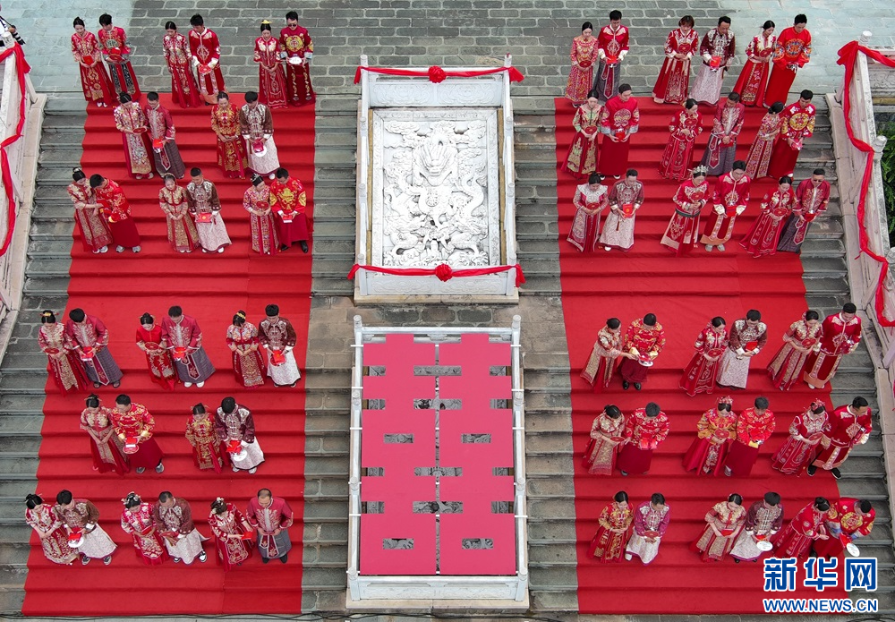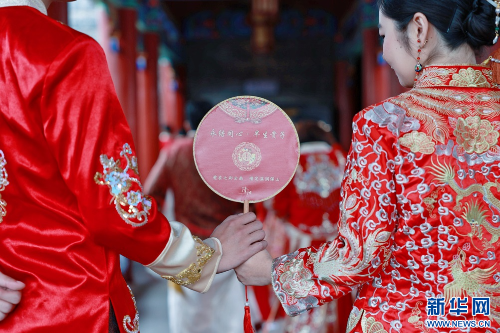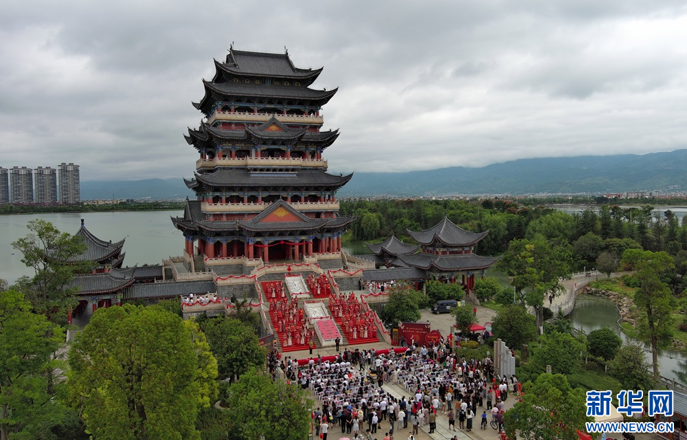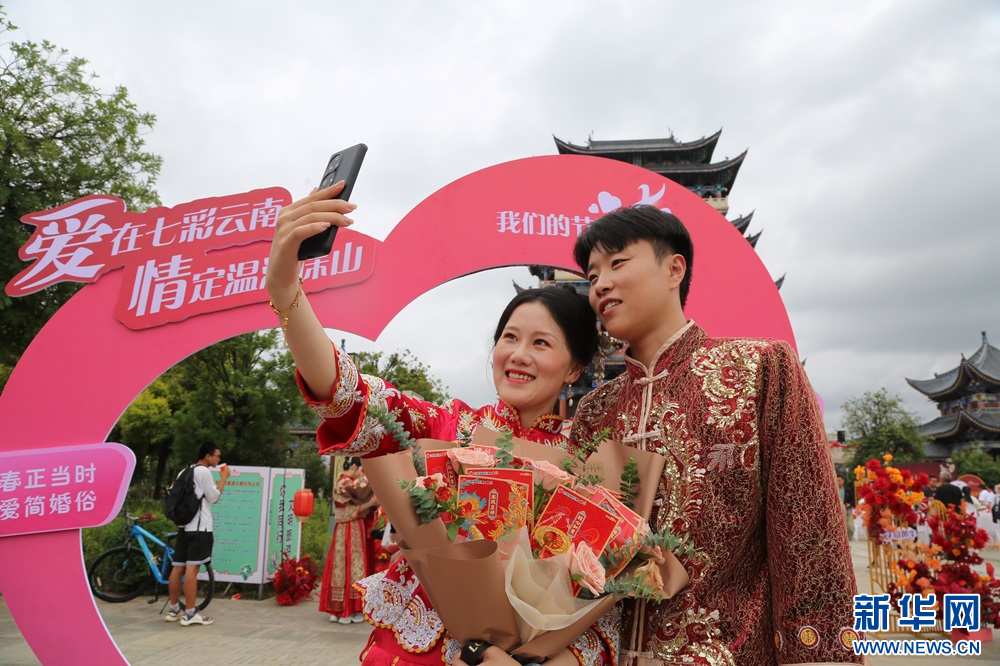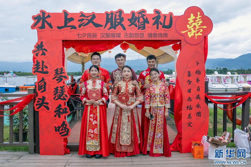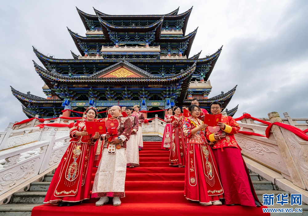 七夕當天,“愛在七彩云南·情定溫潤保山”集體婚禮活動在云南省保山市隆陽區青華海永昌閣舉行。來自全國各地的數對新人及嘉賓,身著華麗的中國傳統婚禮服飾,在現場觀眾的見證下喜結良緣,借此倡導文明婚慶新風尚。
