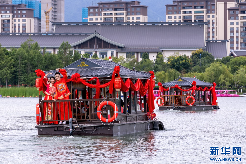 8月10日,參加婚禮的新人及嘉賓在乘船游湖。新華網發(陳暢 攝)