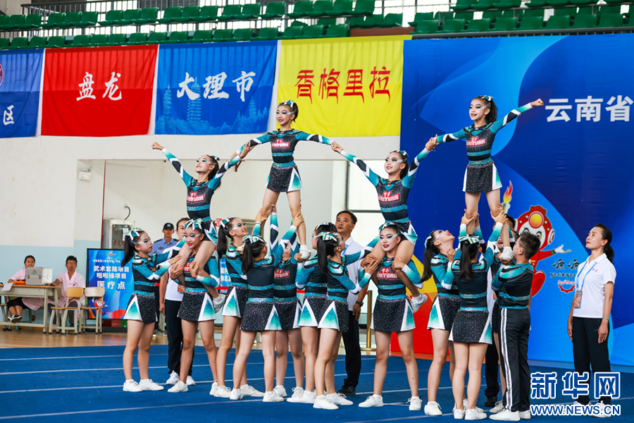 8月12日,啦啦操項目比賽中,東道主開遠隊獲得技巧第一名。新華網發(陶家淇 攝)