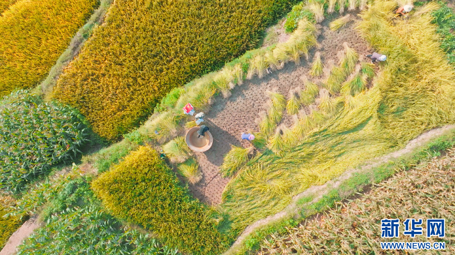 農戶打谷子(8月15日攝)。新華網發(武定縣融媒體中心供圖)