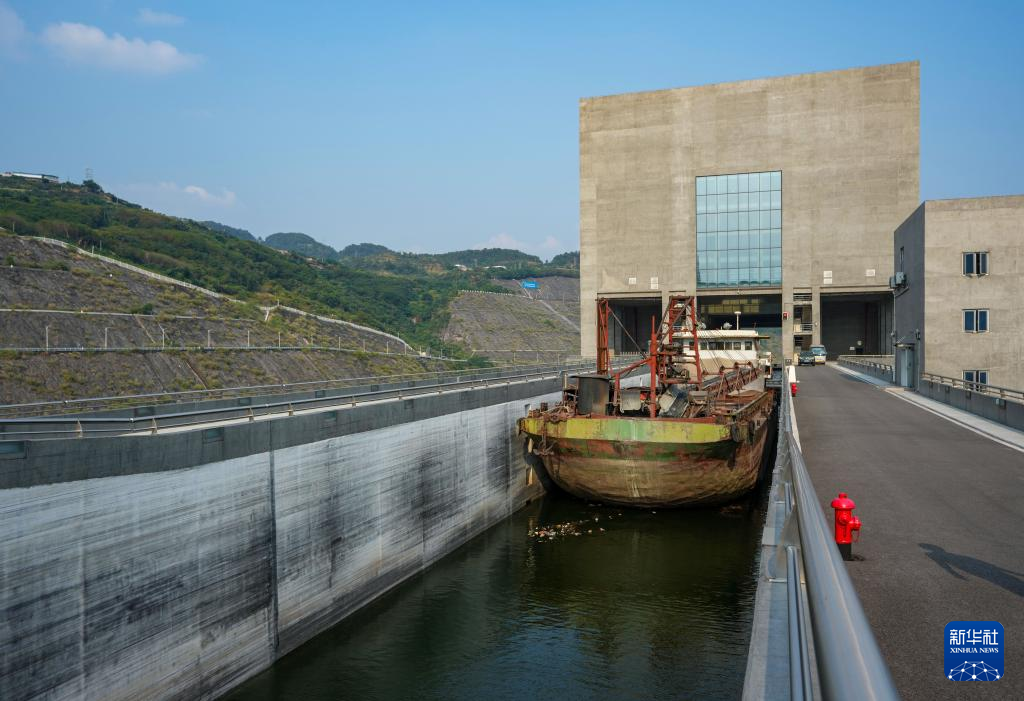8月29日,一艘船通過向家壩水電站升船機到達壩頂。新華社記者 陳欣波 攝