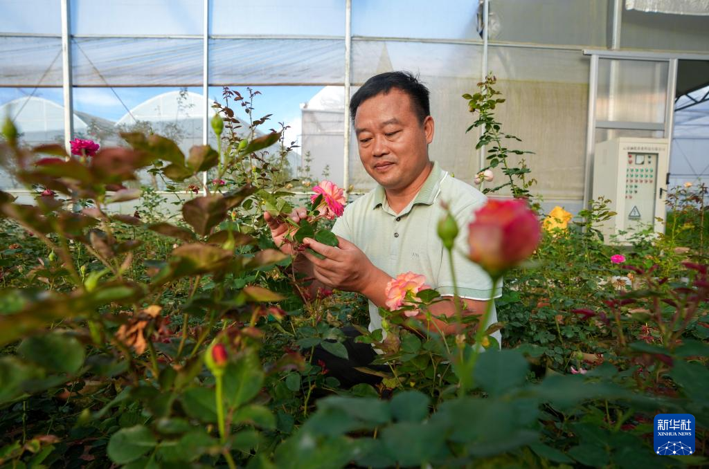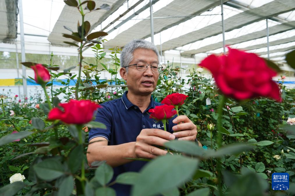 8月23日,李淑斌在位于晉寧區的育種基地大棚內查看月季新品種長勢。新華社記者 陳欣波 攝