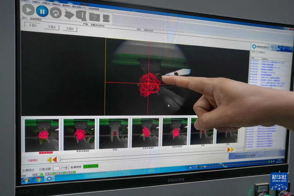 在云南晉寧花卉產業現代化示范園采后處理中心,計算機在實時監測自動分揀流水線上的鮮切花(8月23日攝)。新華社記者 陳欣波 攝