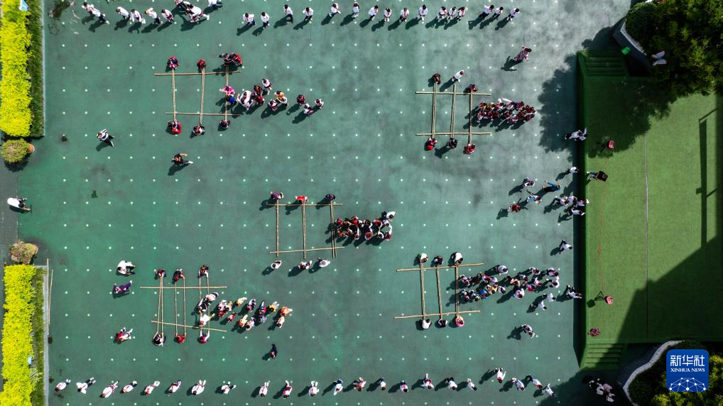 中國-赤道幾內亞友誼小學的學生在操場上跳竹竿舞(無人機全景照片,9月2日攝)。新華社記者 胡超 攝