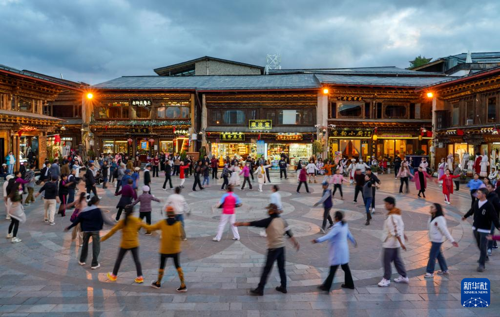 9月27日,游客和當地群眾在獨克宗古城里一起跳舞。