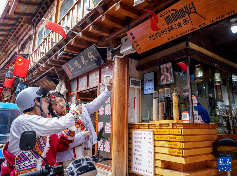 9月27日,游客在獨克宗古城里購買特色美食后拍照打卡。