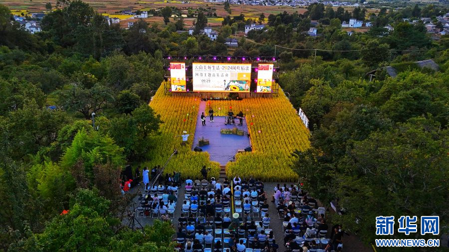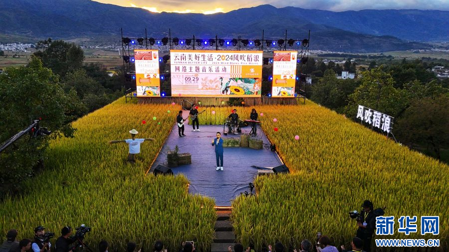 新華網昆明9月30日電(范芳鈺)豐收時節,云南省大理白族自治州洱源縣鳳羽鎮萬畝稻田陸續迎來豐收。伴隨著陣陣稻香,9月29日晚,一場美妙的音樂會在鳳羽鎮佛堂村空中稻田劇場上奏響,“云南美好生活·2024風吹稻浪”網絡主題音樂活動就此拉開帷幕。