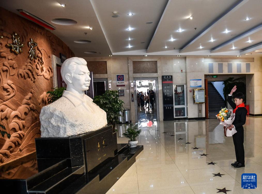 云南省玉溪市的小學生代表在紀念聶耳誕辰110周年活動上向聶耳雕像敬獻鮮花(2022年2月14日攝)。新華社記者 胡超 攝