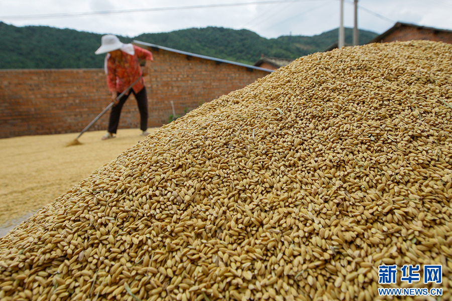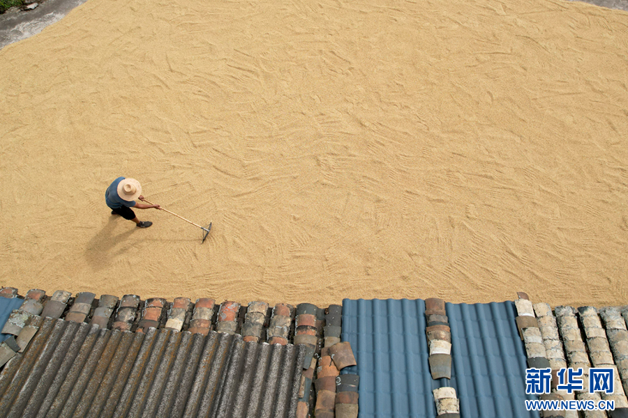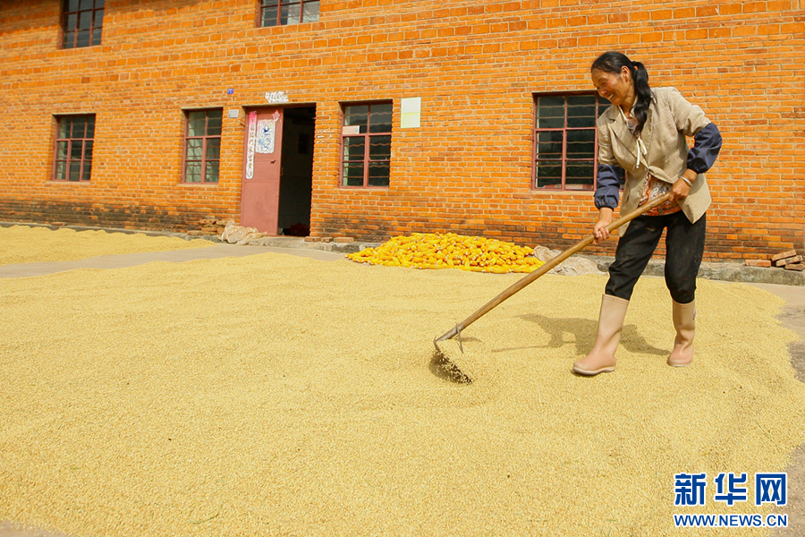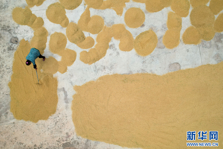 9月28日,云南省曲靖市沾益區威格村,農民正在晾曬稻谷。新華網發(楊俊鵬 攝)
