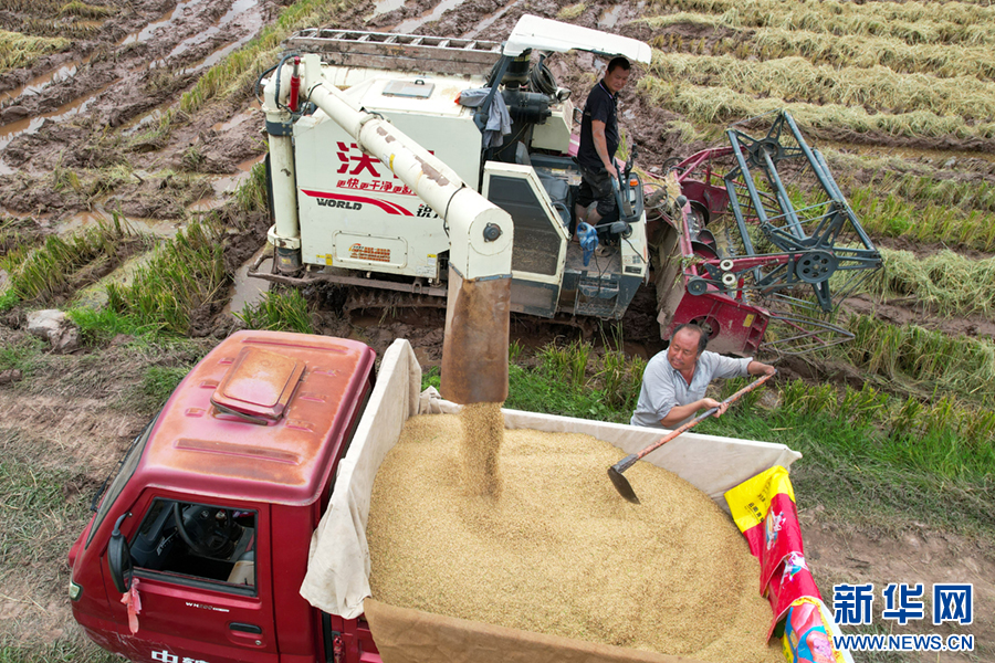 9月28日,云南省曲靖市沾益區威格村,農民正在將稻谷裝車。新華網發(楊俊鵬 攝)