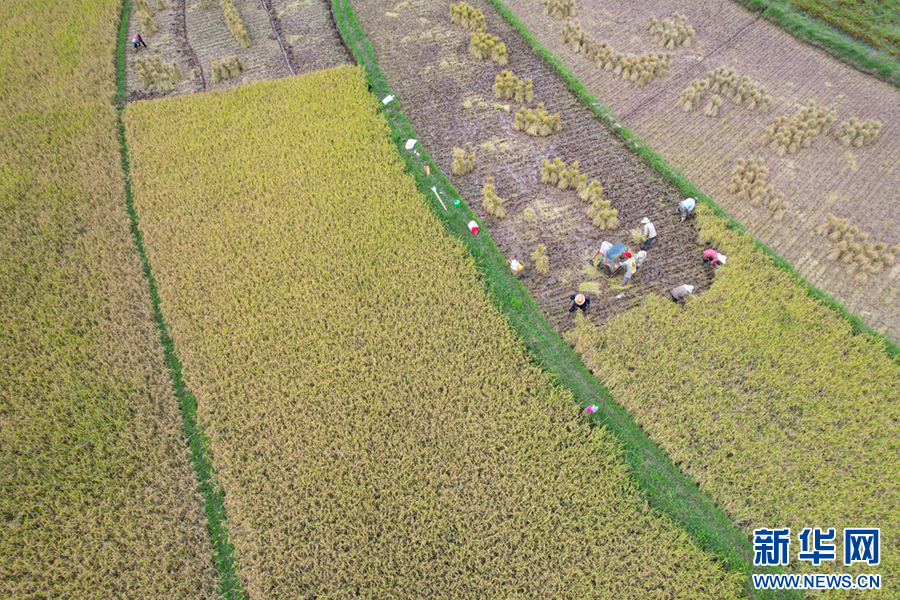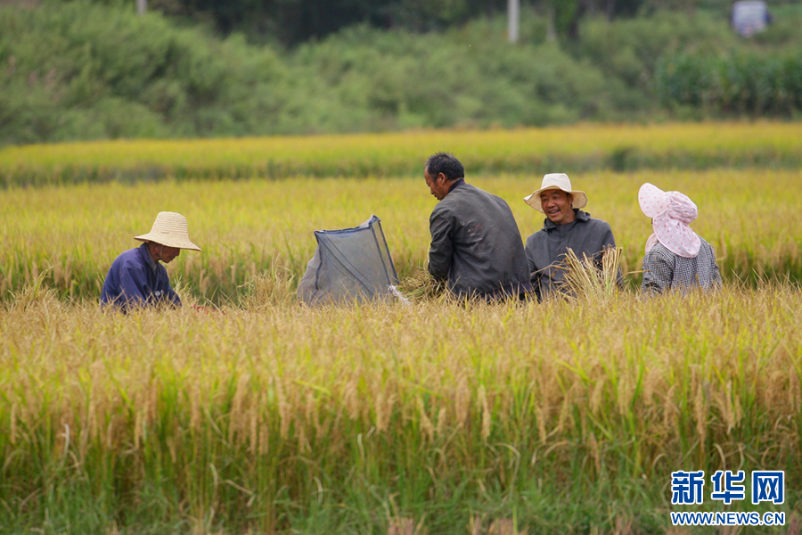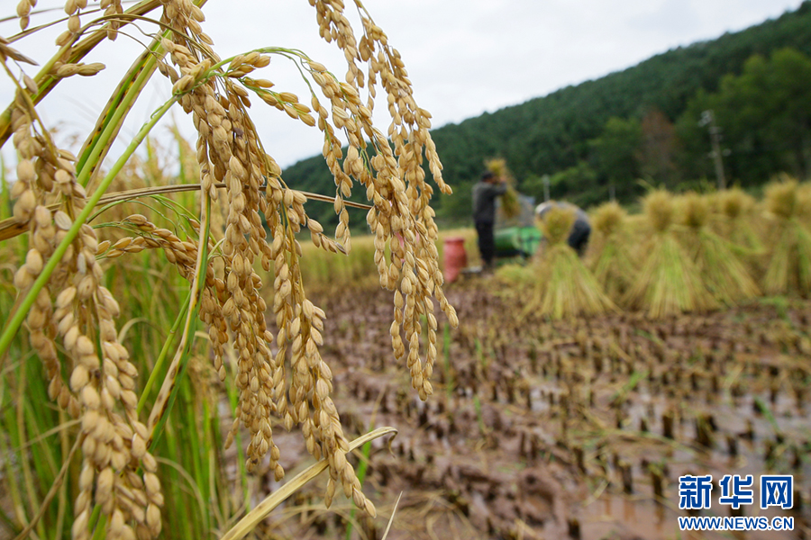 9月28日,云南省曲靖市沾益區威格村,農民正在收割水稻。新華網發(楊俊鵬 攝)