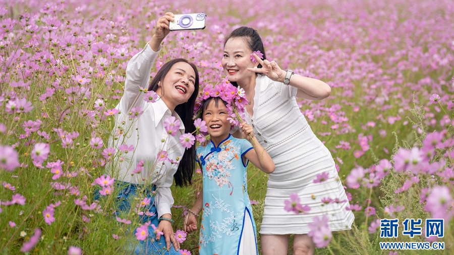游客在鳳羽鎮波斯菊花海中拍照(視頻截圖)。