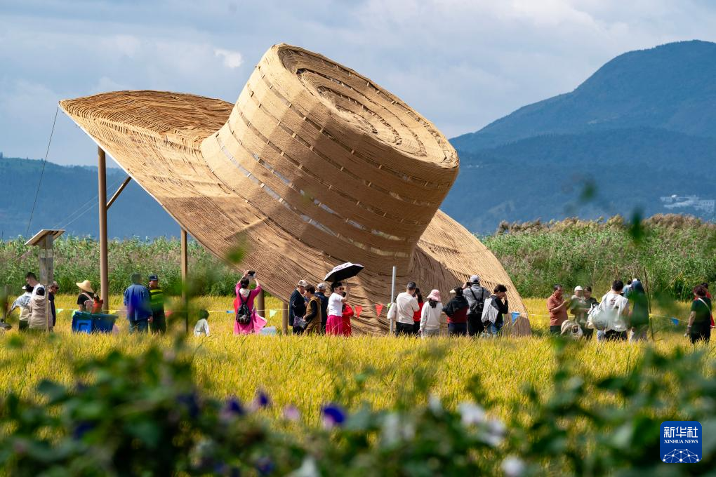 10月6日,人們在云南昆明福保半島·大地豐收藝術節上觀看一個大型草帽。新華社記者陳欣波攝