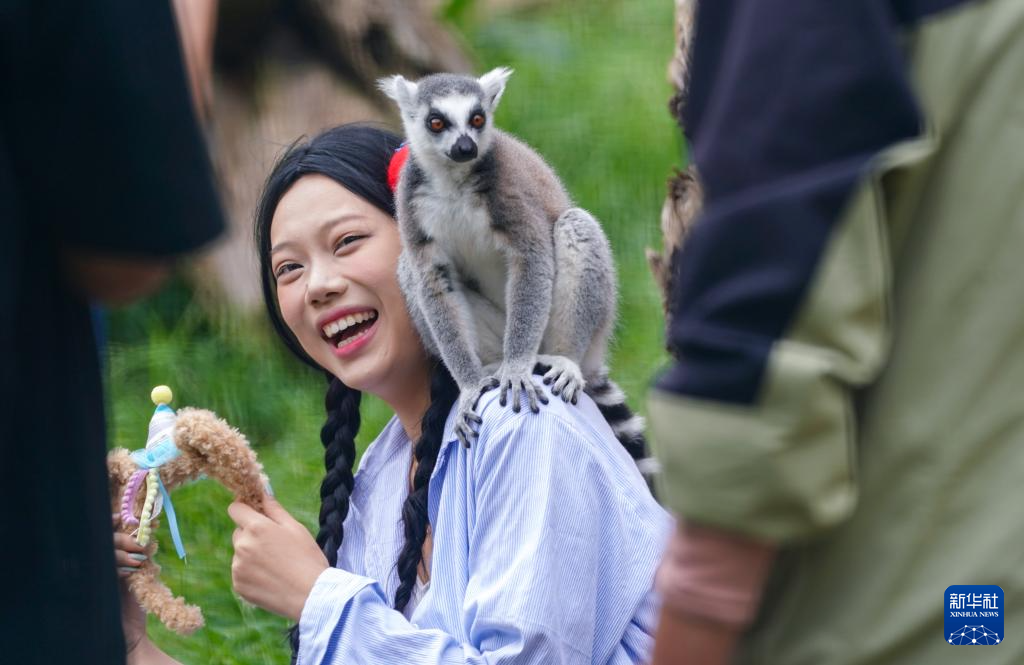 10月4日,一名游客在位于昆明的云南野生動物園內與環尾狐猴互動。新華社記者陳欣波攝