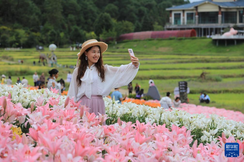 10月2日,游客在云南省騰沖市曲石鎮棲花嶺百合花海游玩時拍照。新華社發(龔祖金攝)