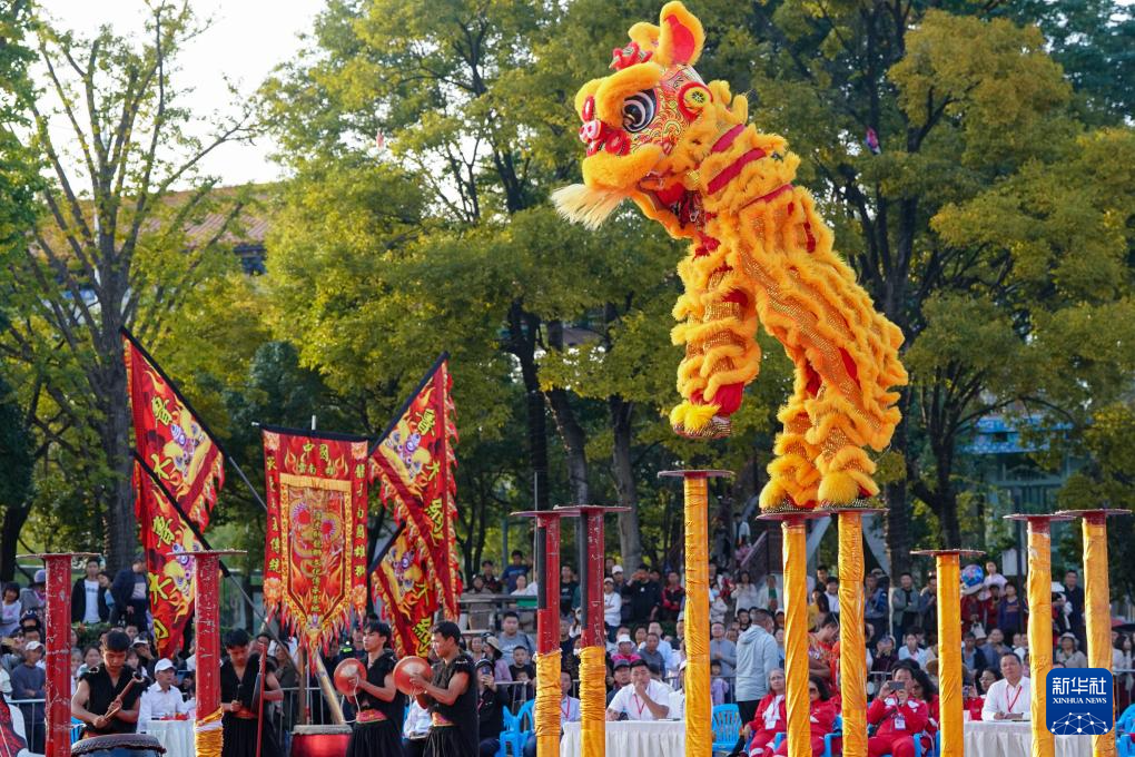 10月19日,云南魯木納龍獅藝術團隊員在南獅高樁自選套路項目中比賽,最終他們獲得該項目銅獎。新華社記者 陳欣波 攝