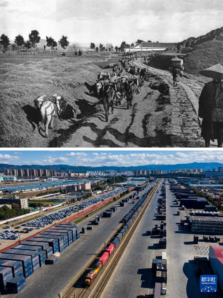 拼板照片:上圖為清朝末年,馱運著貨物的馬幫準備進入昆明城區(資料圖片由殷曉俊提供);下圖為中老鐵路國際貨物列車(前)準備從昆明開往老撾萬象(無人機照片,2022年1月1日攝)。新華社記者 胡超 攝