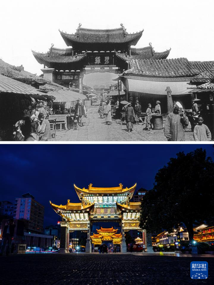 拼板照片:上圖為清末時期的昆明碧雞坊(資料圖片由殷曉俊提供);下圖為如今昆明市碧雞坊夜景(2023年6月13日攝)。新華社記者 江文耀 攝