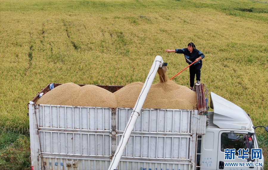 工人開始機械收割水稻(10月14日攝)。新華網發(王正鵬 攝)