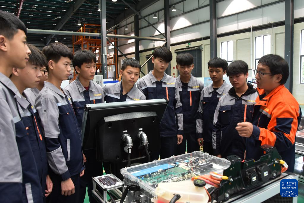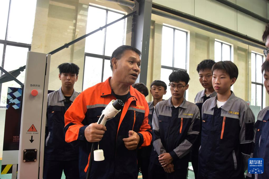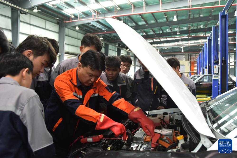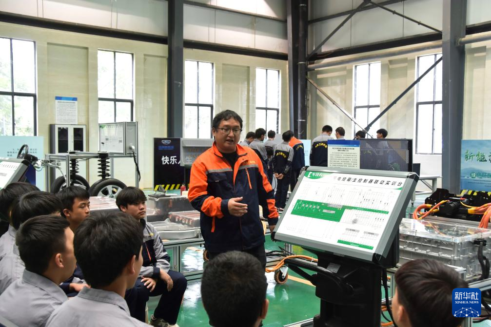 10月23日,在紅河職業技術學院汽車工程技術實訓中心的新能源汽修實訓區域,教師給學生講解新能源汽車維修知識。新華社發(薛瑩瑩 攝)