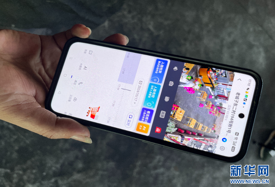 老依燒烤店的老板尹照富在手機上查看店內情況(攝于10月17日)。新華網 劉馨蔚 攝