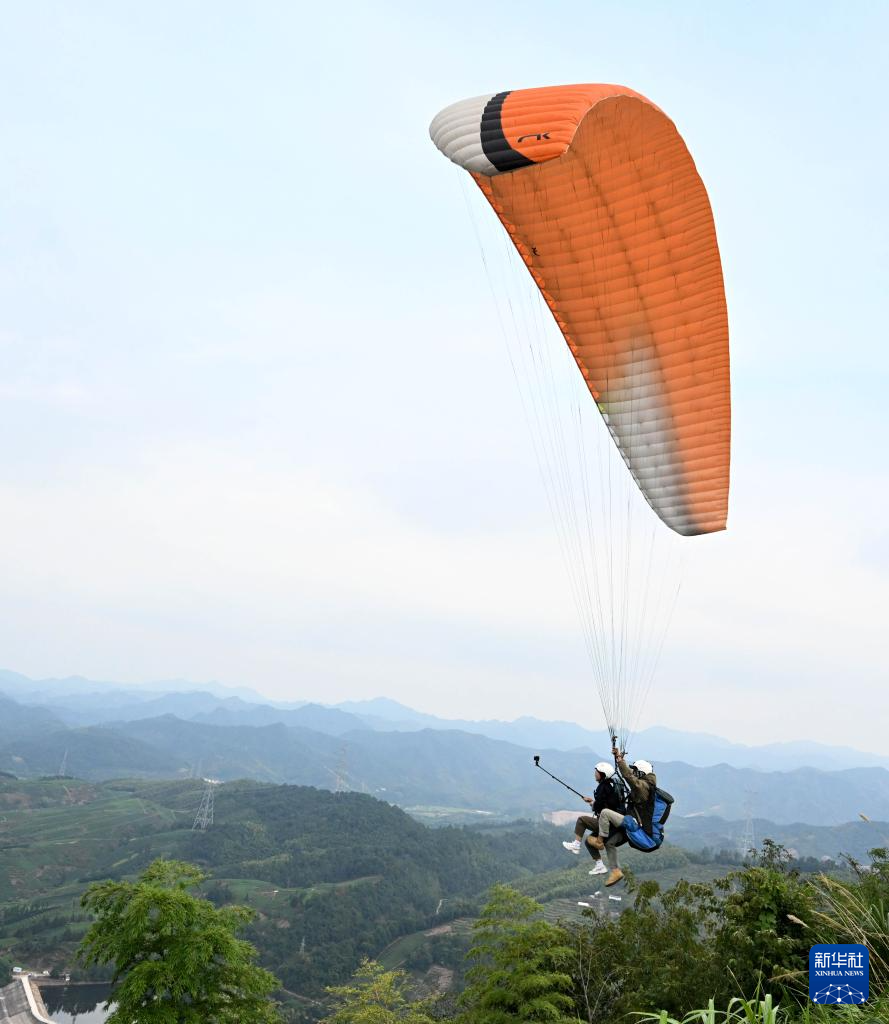 10月4日,游客在位于浙江省武義縣的大斗山飛行營地體驗滑翔傘,空中觀賞茶園、花海風光。新華社發(張建成 攝)