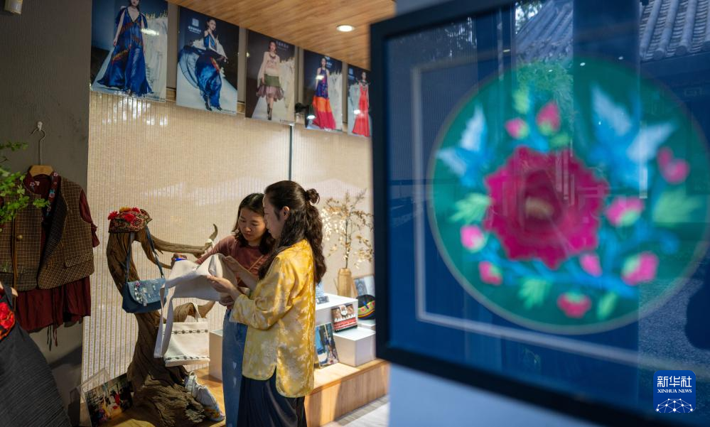 9月7日,國家級非物質文化遺產代表性項目彝族服飾州級代表性傳承人盧潔瑩(右)在自己云南楚雄的工作室內向訪客介紹彝繡服飾。盧潔瑩是赴巴黎參展彝族服飾作品的設計師之一。新華社記者 江文耀 攝