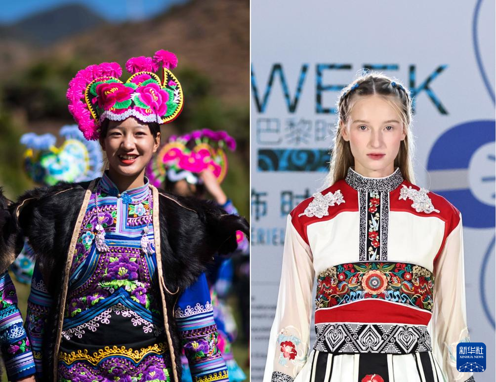 這是一張拼版照片:左圖為2019年2月19日拍攝的一名年輕女孩在楚雄彝族自治州永仁縣直苴村參加賽裝節(新華社記者 江文耀 攝);右圖為2024年9月26日拍攝的模特在法國巴黎舉行的中國楚雄非遺服飾時裝展上展示時裝(新華社記者 高靜 攝)。