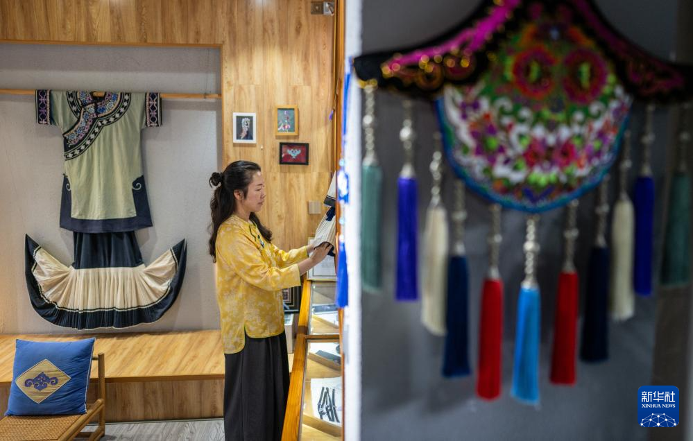 9月7日,國家級非物質文化遺產代表性項目彝族服飾州級代表性傳承人盧潔瑩在自己云南楚雄的工作室內查看彝繡服飾。盧潔瑩是赴巴黎參展彝族服飾作品的設計師之一。新華社記者 江文耀 攝