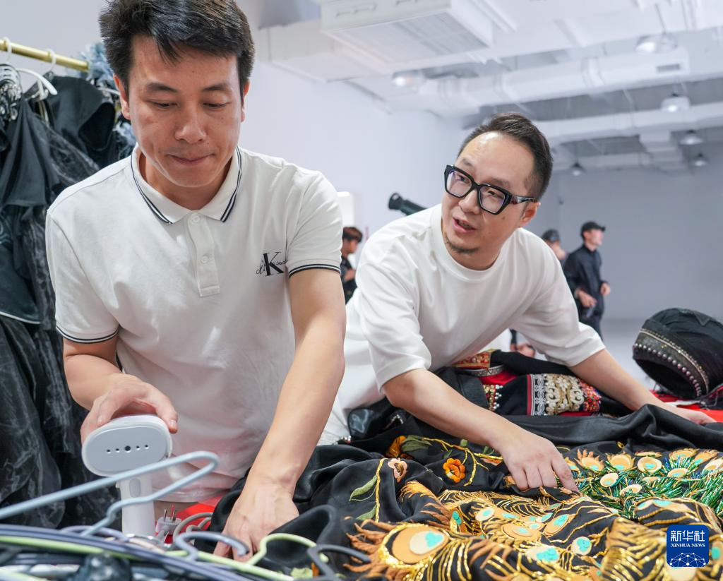 8月27日,在昆明一處攝影棚內,云南藝術學院設計學院服裝與服飾設計系教師范佳(右)和同事打理彝繡服飾。范佳是赴巴黎參展彝族服飾作品的設計師之一。新華社記者 王靜頤 攝