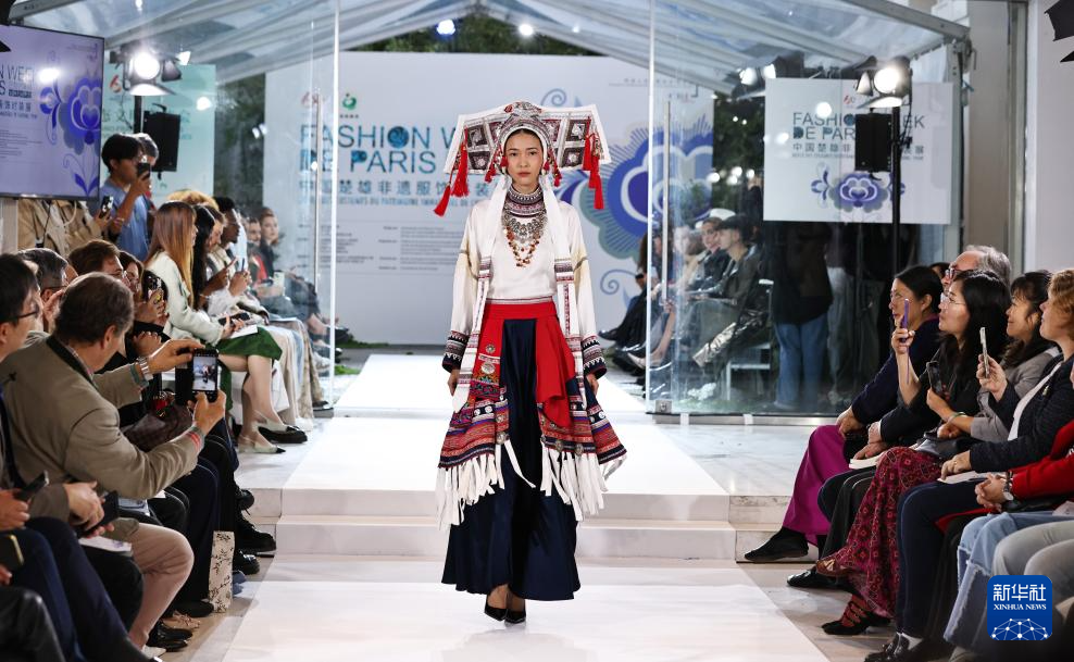 9月26日,模特在法國巴黎舉行的中國楚雄非遺服飾時裝展上展示時裝。新華社記者 高靜 攝